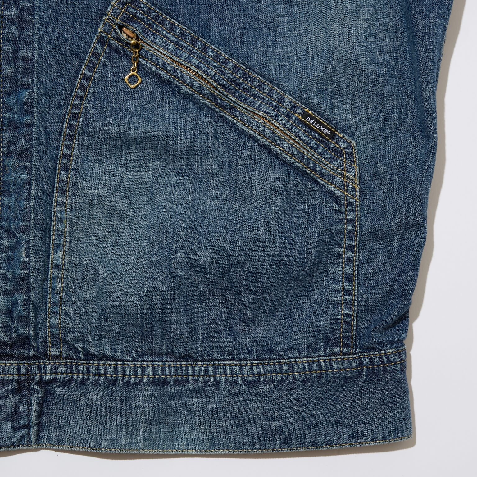 首裏に MINEDENIM オリジナルネーム、左腰ポケット 縁に DELUXE ピスネームを叩きつけ。身幅にややゆとりのあるシルエット。MINEDENIMとのコラボレーションモデル。