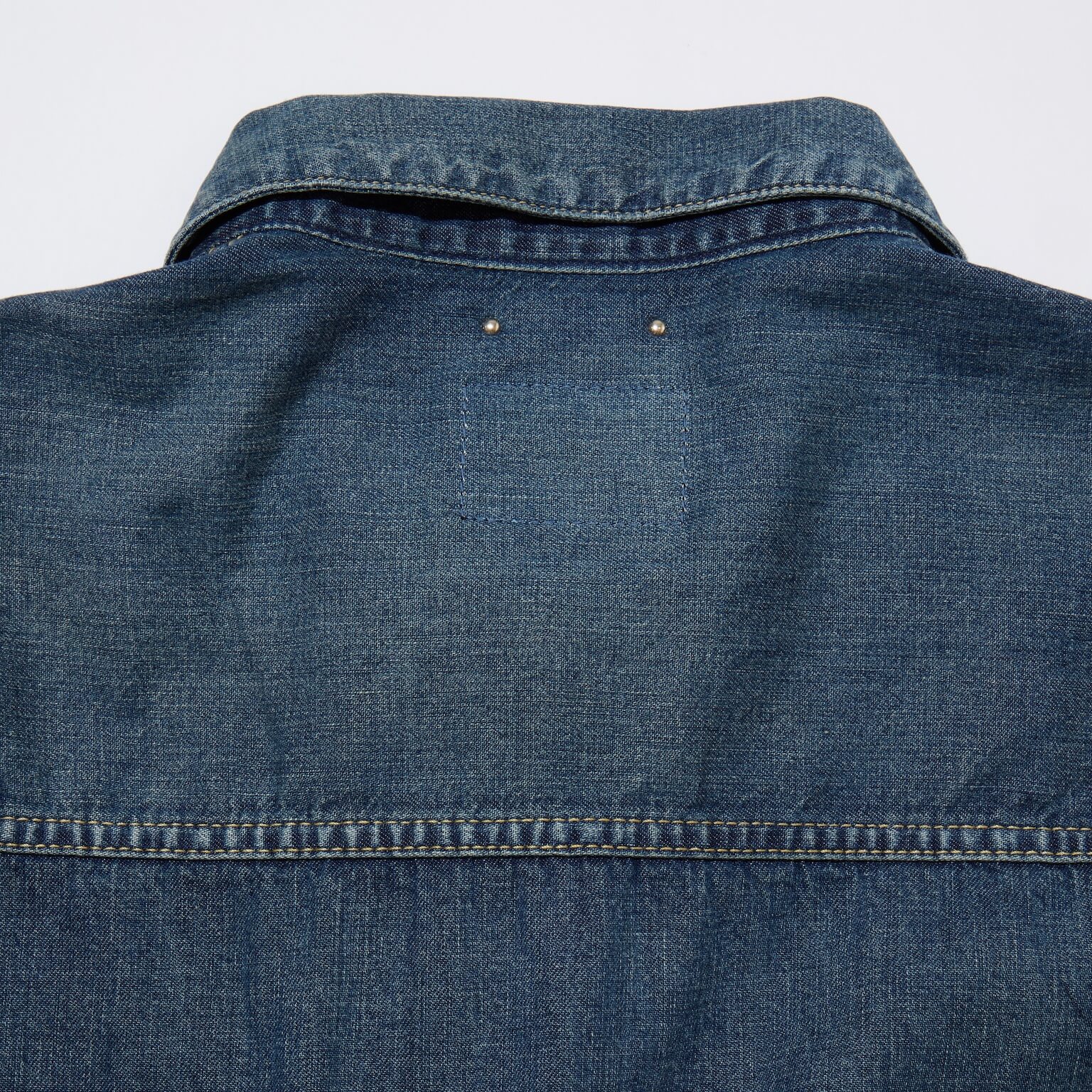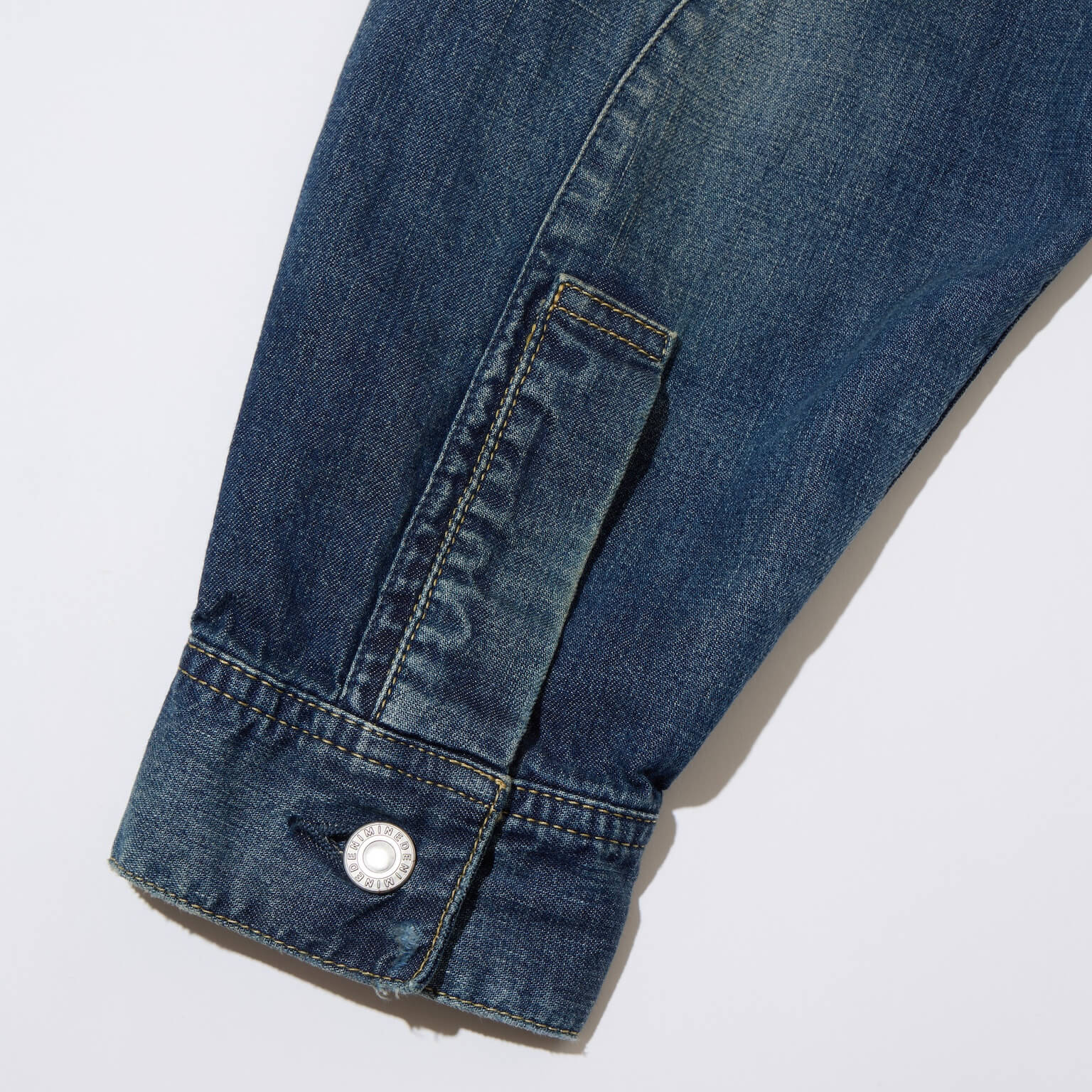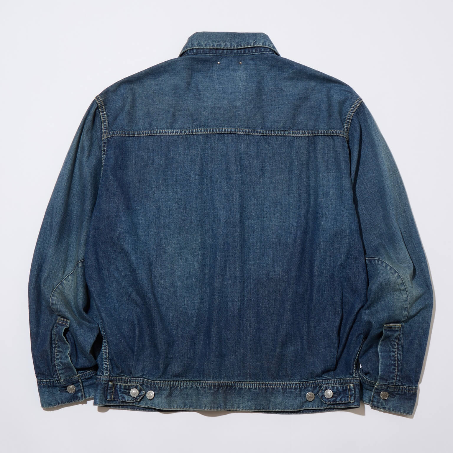 身頃全体に加工を施し経年変化した色落ちを表現、肘内側にはハチノス、シーム箇所にはパッカリングが見られる。